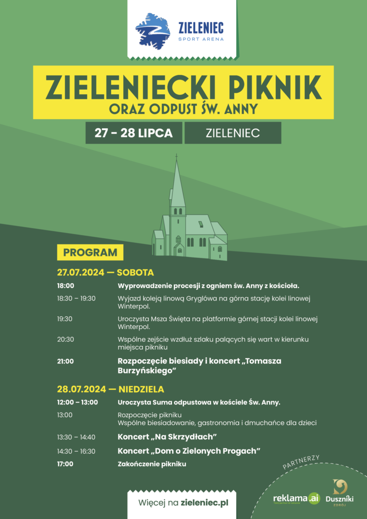 Zieleniec to wyjątkowe miejsce na mapie Dolnego Śląska, które szczególnie chętnie gości i gorąco zaprasza całe rodziny. Latem cała okolica to kwintesencja piękna dolnośląskiej przyrody, która staje się idealnym miejsce do aktywnego wypoczynku całych rodzin oraz doskonała bazą wypadowa do zwiedzania Ziemi Kłodzkiej. Tym bardziej pragniemy was zaprosić na jeden z najważniejszych punktów w kalendarzu zielenieckich wydarzeń – doroczny Piknik oraz odpust św. Anny, który w tym roku przypada na 27-28 lipca.